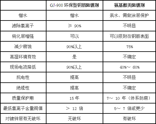 GJ-900環保型鋼筋阻銹劑與氨基醇類阻銹劑比較: