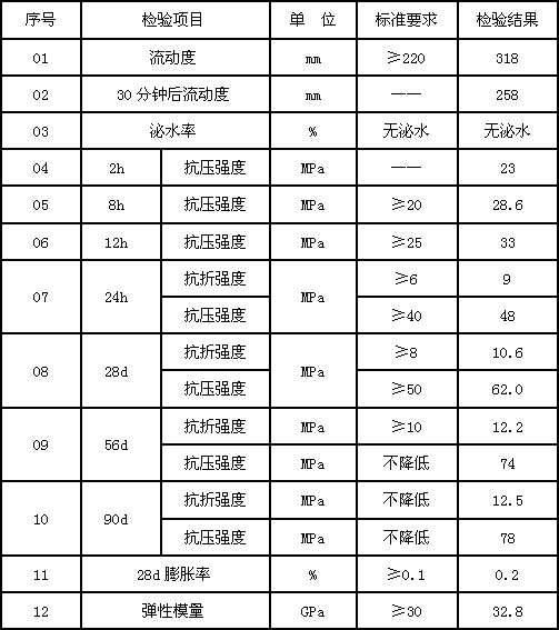 其性能指標符合《京滬高速鐵路高性能混凝土施實施細則》與《客運專線橋梁盆式橡膠支座暫行技術條件》等國家與鐵路行業標準技術要求。具有優異的流動性,自流找平,不需振搗,抹壓,施工速度快、方便;具有非常高的小時強度、后期強度高,不收縮;根據不同的施工溫度,2小時即可獲得20-40Mpa的抗壓強度,抗折強度高;具有微膨脹性能及優異的抗開裂性能;適應溫度范圍寬,在-5℃~-35℃條件下,無需任何輔助保溫或降溫措施都可施工;在高溫或低溫條件下,能夠同時保證強度發展和施工流動性的需要。