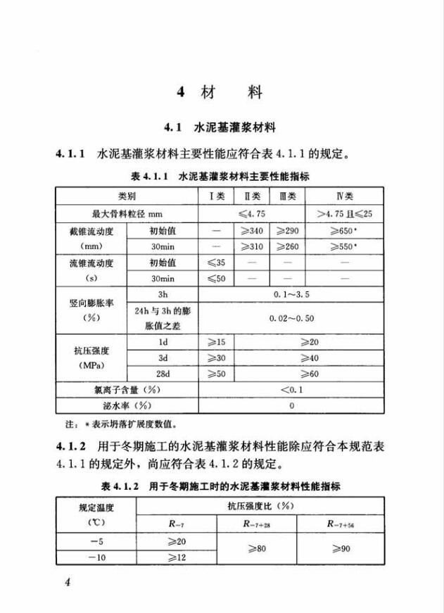 對于快凝快硬型水泥基灌漿材料,由于早期強度高,甚至2h的抗壓強度能達到20MPa,其流動性損失必然大,因此表4.1.1的30min流動度保留值不適用于快凝快硬型水泥基灌漿材料。本規范對該類水泥基灌漿材料的流動度(或坍落度和坍落擴展度)的保留值、24h與3h的豎向膨脹率之差及24h內抗壓強度值不作規定。